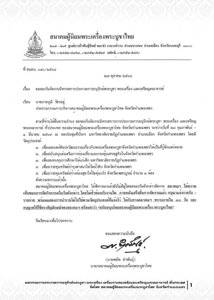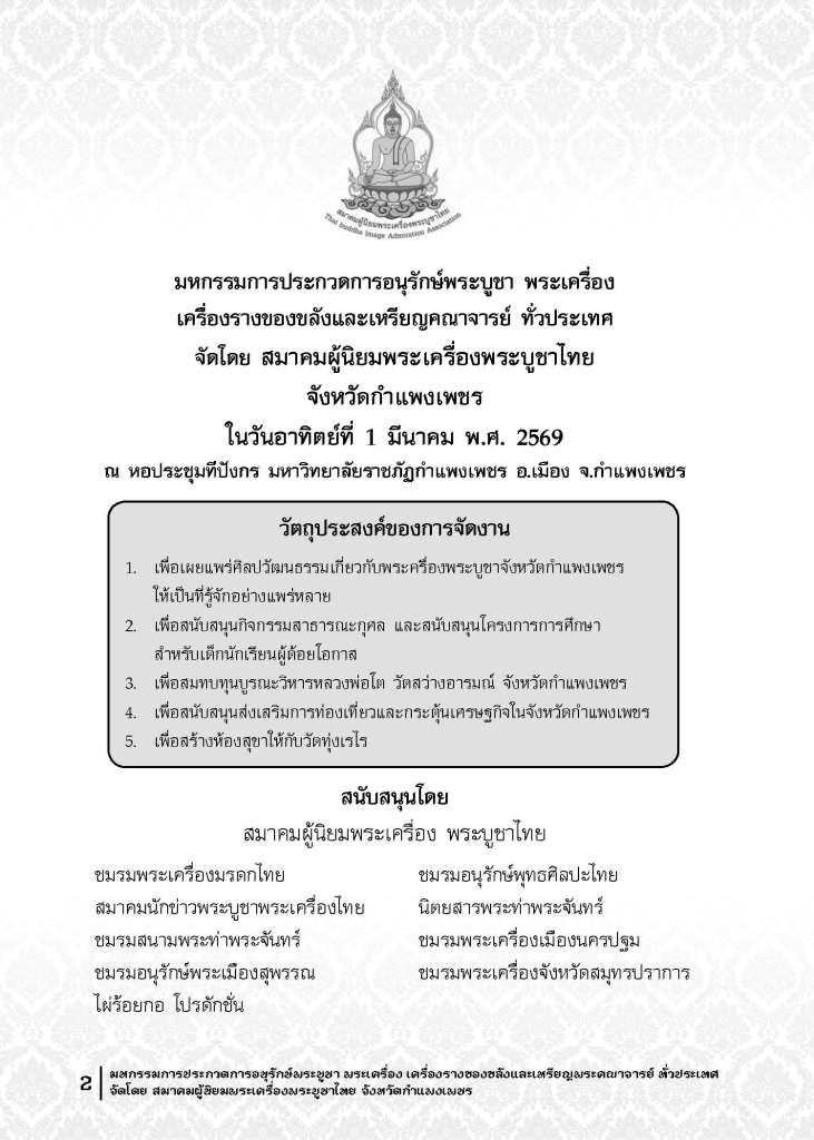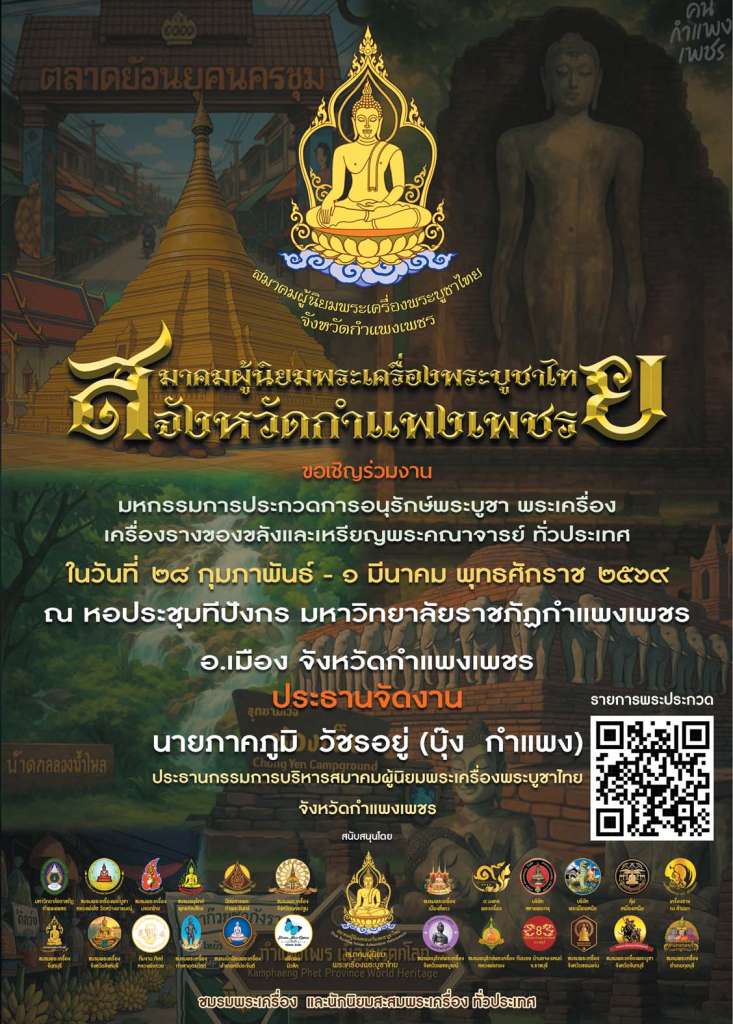บุ๊ง กำแพง(ภาคภูมิ วัชรอยู่) ประธานกรรมการบริหารสมาคมฯ จ.กำแพงเพชร ขอเชิญเพื่อนพ้องน้องพี่และนักนิยมสะสมพระเครื่อง ร่วมงาน มหกรรมการประกวดการอนุรักษ์พระบูชา พระเครื่อง เครื่องรางของขลัง และเหรียญพระคณาจารย์ทั่วประเทศ ในวันเสาร์ 28 กุมภาพันธ์ 2569-อาทิตย์ที่ 1 มีนาคม พ.ศ. 2569 ณ หอประชุมทีปังกร มหาวิทยาลัยราชภัฏกำแพงเพชร อ.เมือง จ.กำแพงเพชร โดยมี คุณภาคภูมิ วัชรอยู่(บุ๊ง กำแพง) ประธานกรรมการบริหารสมาคมผู้นิยมพระเครื่องบูชาไทย จ.กำแพงเพชร เป็นประธานจัดงาน