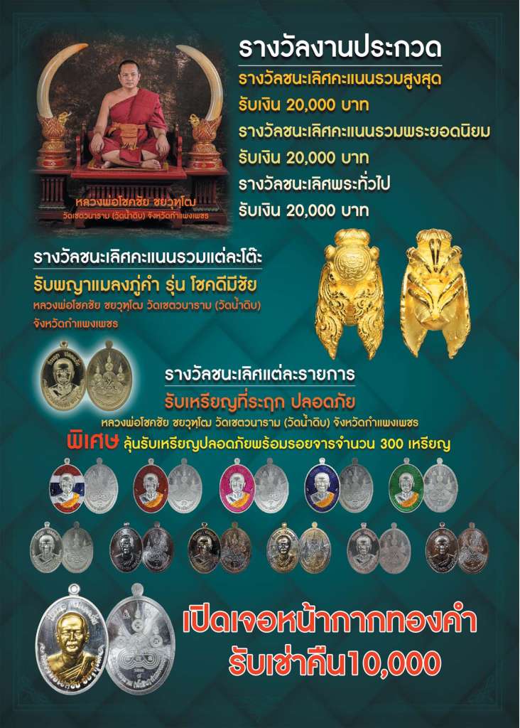 - รางวัลชนะเลิศแต่ละรายการ รับเหรียญที่ระฤก ปลอดภัย หลวงพ่อโชคชัย ชยวุฑฺโฒ วัดเชตวนาราม(วัดน้ำดิบ) จังหวัดกำแพงเพชร พิเศษ ลุ้นรับเหรียญปลอดภัยพร้อมรอยจาร จำนวน 300 เหรียญ ผู้ที่เปิดเจอเหรียญหน้ากากทองคำ รับเช่าคืน 10,000 บาท