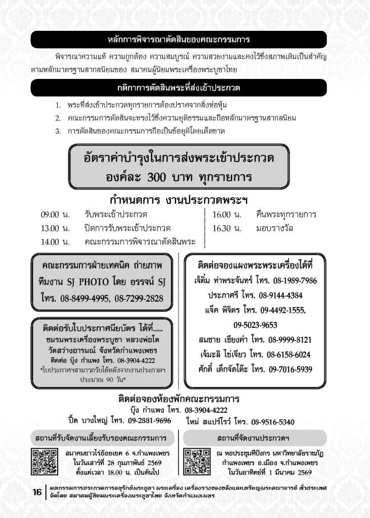 ติดต่อจองห้องพักกรรมการ ได้ที่ บุ๊ง กำแพง 083-904-4222, ปื๊ด บางใหญ่ 092-881-9696, ใหม่ สแปร์โร่ 089-516-5340 ใบประกาศฯ หลังจากงานประกวดประมาณ 90 วันติดต่อได้ที่ ชมรมพระเครื่องพระบูชาหลวงพ่อโต วัดสว่างอารมณ์ จ.กำแพงเพชร ติดต่อ บุ๊ง กำแพง 083-904-4222